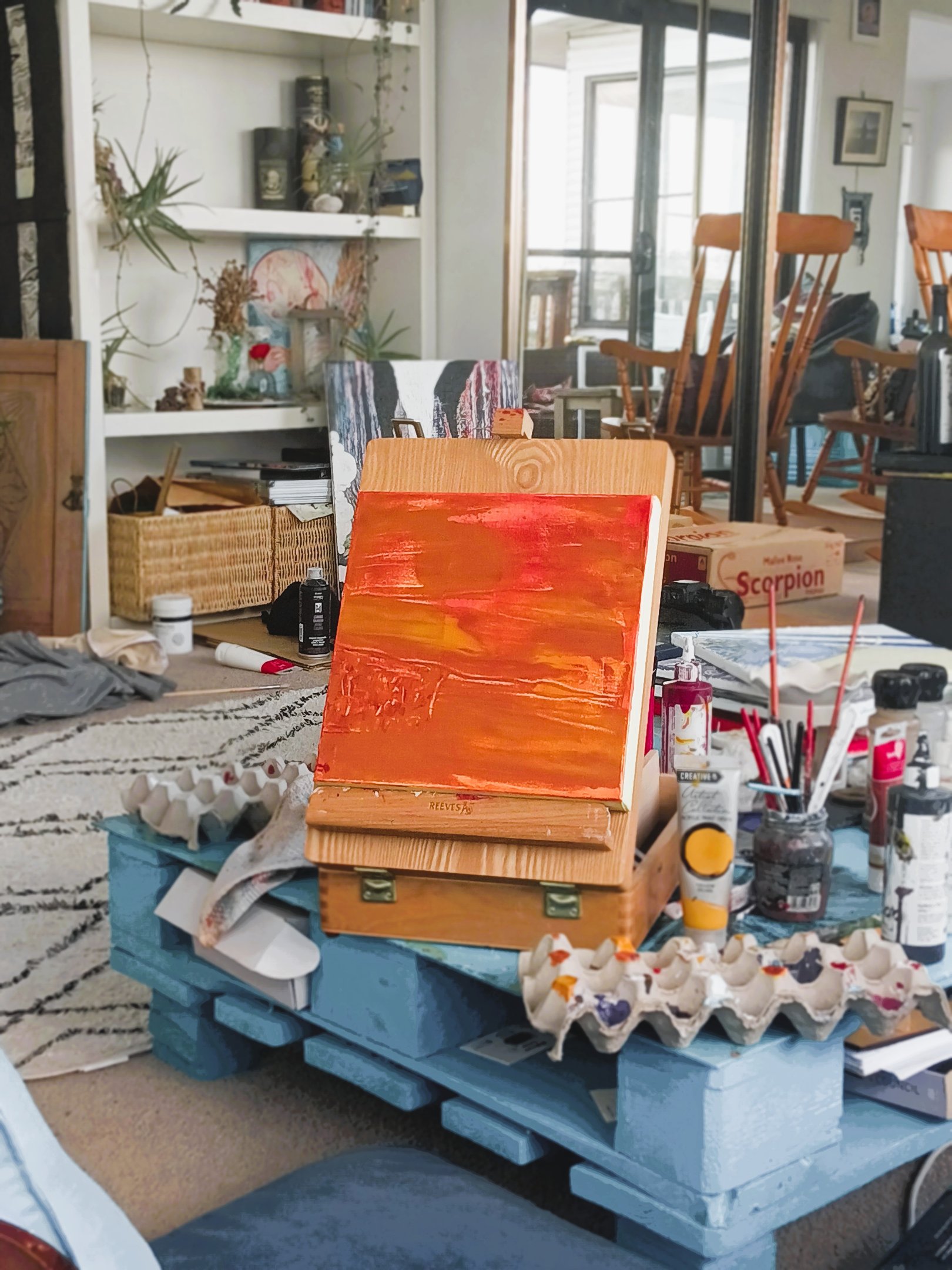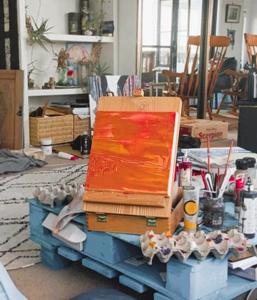 Drawings and canvas with earthy hues.